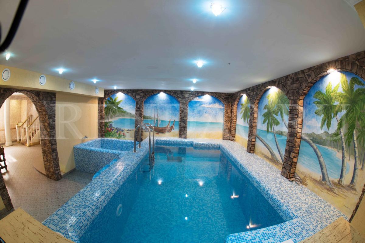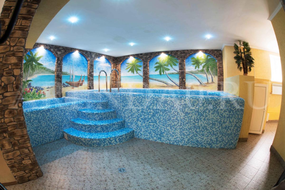 • Сауна: На цокольном этаже с двумя бассейнами (взрослый 5x3 м и детский 2x2 м), полы с подогревом.