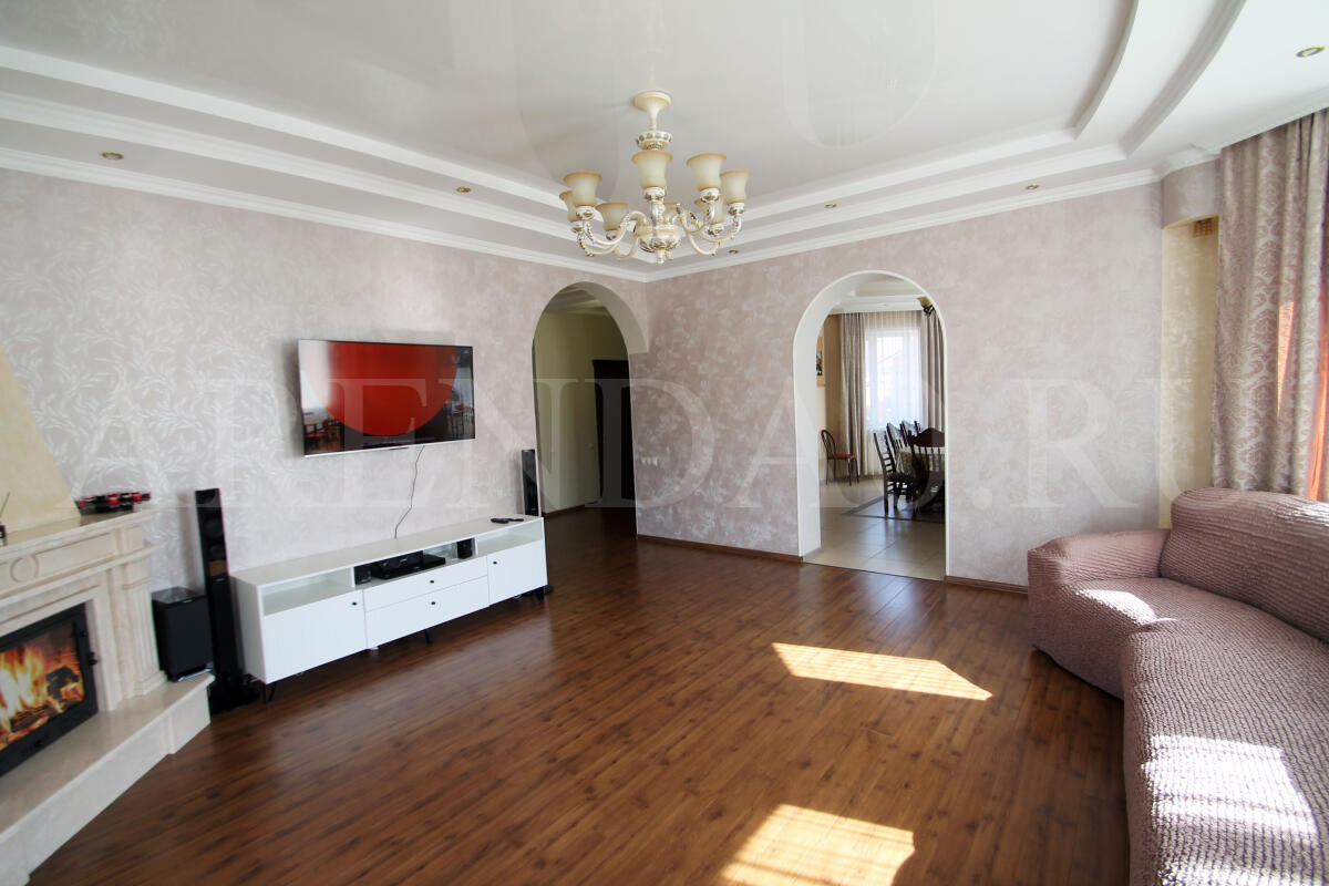 • Просторная гостиная с большим диваном, музыкальной акустикой, ТВ и камином (декоративным).